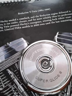 Inside, you’ll find 12 original drawings of engines inspired by legendary Harley-Davidson® motorcycles, each recreated with precision, patience, and artistic flair. Every illustration was drawn entirely by hand, with hundreds of hours dedicated to capturing the spirit of classic engines — from early singles to modern Milwaukee-Eights.